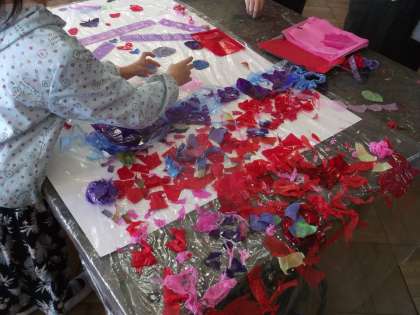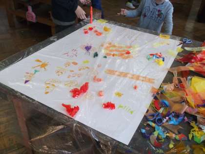 共同制作として「ひかりのさしこむ絵」をグループで作成しています。
