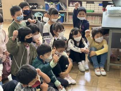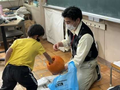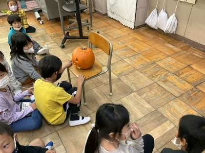 低学年の外国語では、大きなカボチャが登場し、子どもたちが大喜びです。