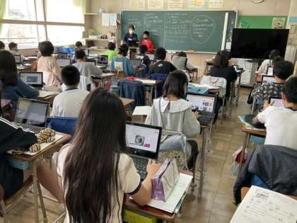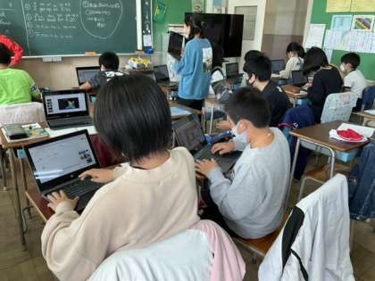 3校時、タブレットでスライドを作っています。