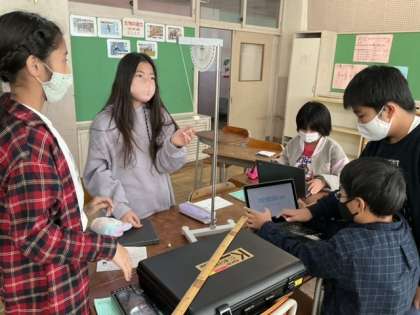 時間の計測や振り子の往復回数のカウントなど、手分けをして実験しています。