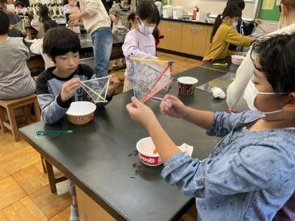 三角錐の骨組みの枠に糸を巻きつけています。