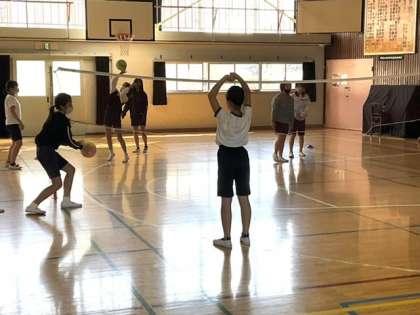 3校時、体育館でバレーボールをしています。