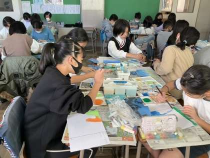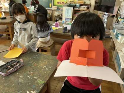 図工では、飛び出す仕組みのある作品や思い出の一場面を描きました。