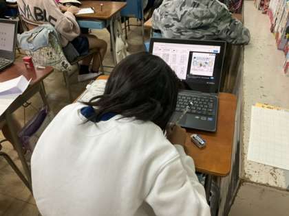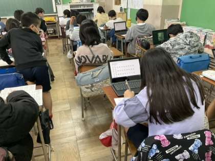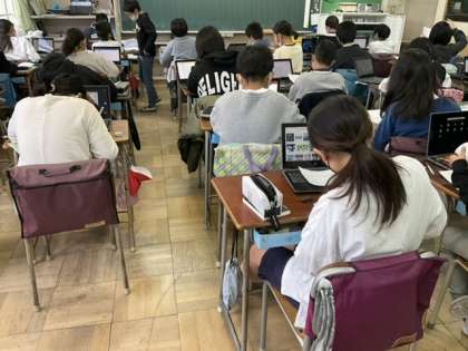1校時、漢字プリントが終わって、本の帯づくりをしています。