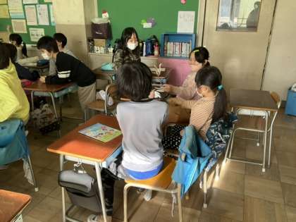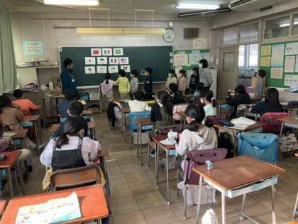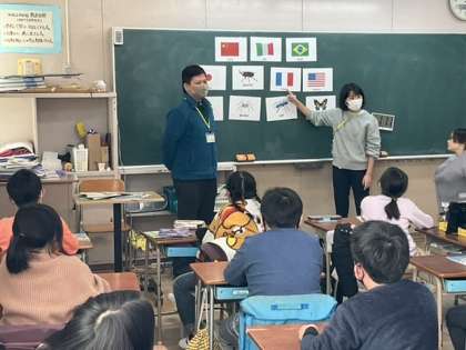 5校時、黒板に国旗と昆虫の絵が掲示してあります。