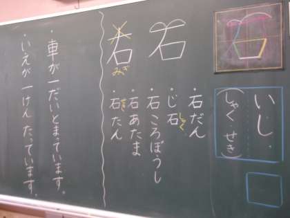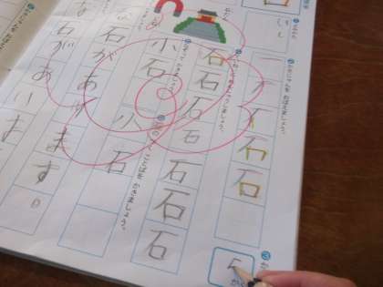 漢字の学習です。「石」という字を書いています。