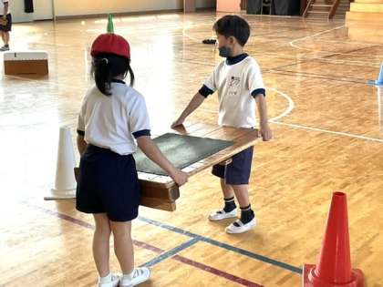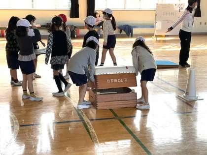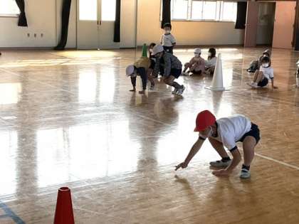 準備運動で、手足を着いて跳ぶ「うさぎ跳び」をしていました。