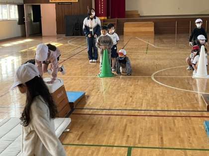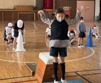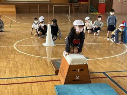 踏み切り板からジャンプして、跳び箱に乗る練習をしています。