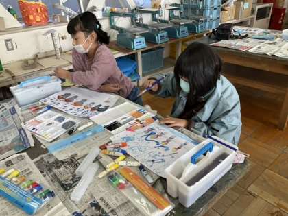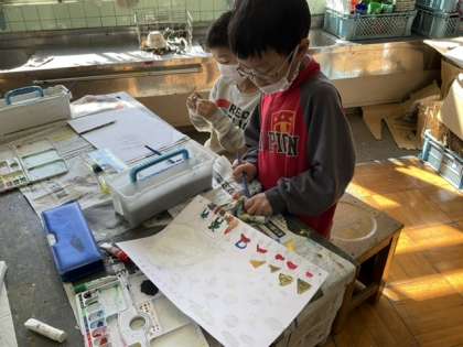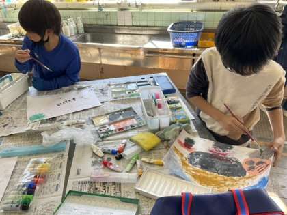 4校時、「かさこじぞう」の話から聞こえてくる音を感じながら描こうと言う活動です。