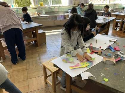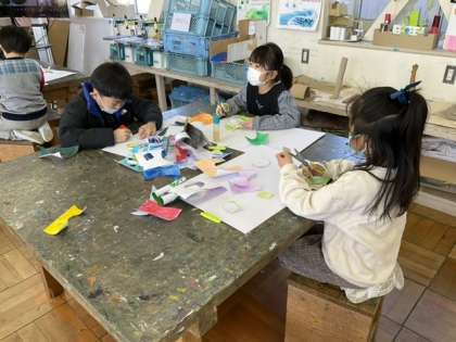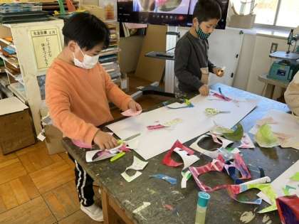 様々な模様や柄の紙を切って、画用紙に貼って作品を作ります。