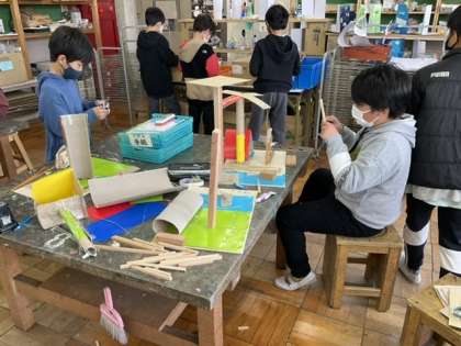 1校時、「ひみつのすみか」と言う作品づくりです。