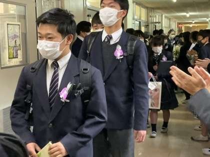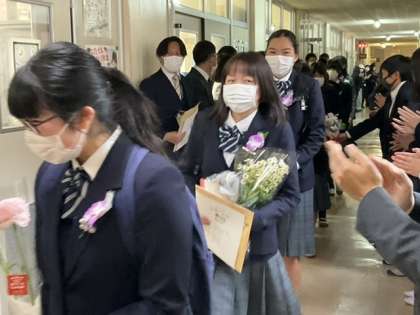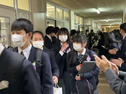 卒業生が、笑顔で見送りの列の間を歩いていました。
