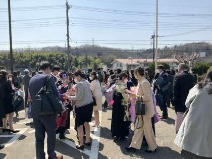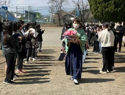 校庭で、在校生、保護者、教職員でお見送りをしました。