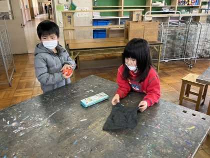 色画用紙をくしゃくしゃにしてから、袋状にします。