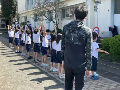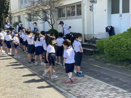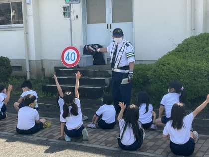 歩行者用信号が点滅した時の行動について、説明を聞いています。