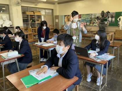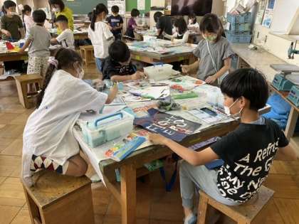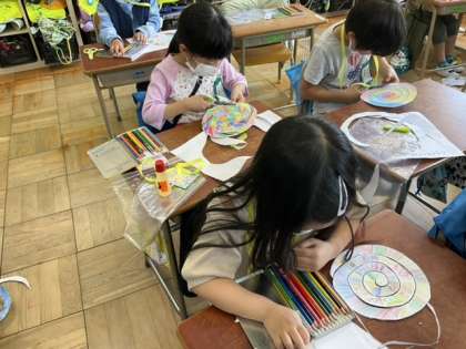 小1のぐるぐるへび、小3のTシャツ、中2の漢字を使った作品づくりです。