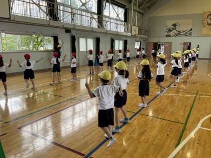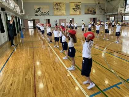 1校時、体育館で合同体育です。