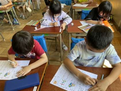 ひらがな「ま」の練習をしています。