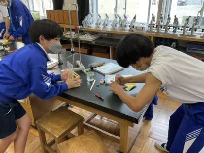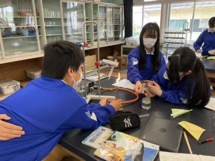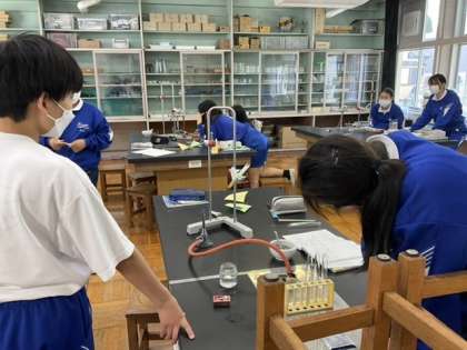 1校時、理科室で実験中です。