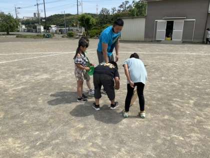 校庭で、地面の傾きを調べています。