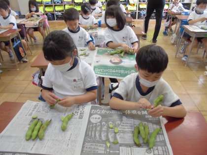 1年生が「空豆のさやむき」をしてくれました。