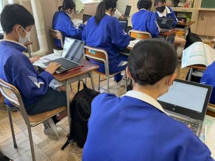 中3では、八王子市が導入したスピーキングアプリを使用した学習をしています。
