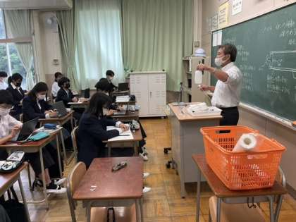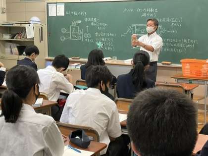 教室で、演示実験をしています。