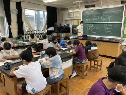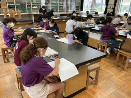 1校時、理科室にいます。