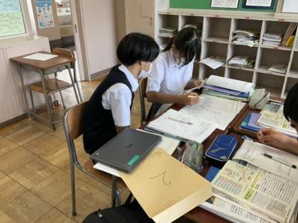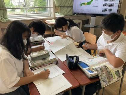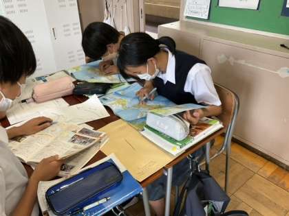 地図帳、ノート、教科書など、複数の教材を使ってまとめています。