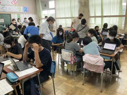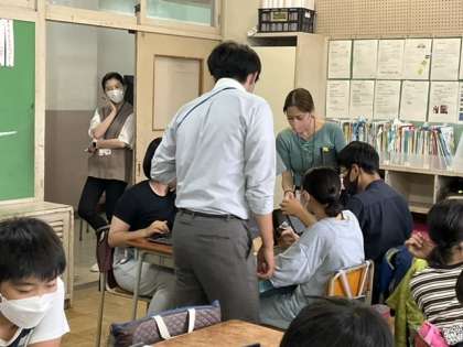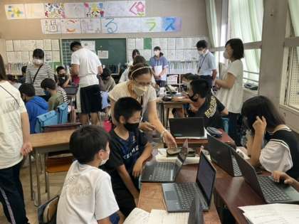 この授業には、ALTとICT支援員も子どもたちの学習のサポートに入っています。
