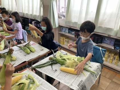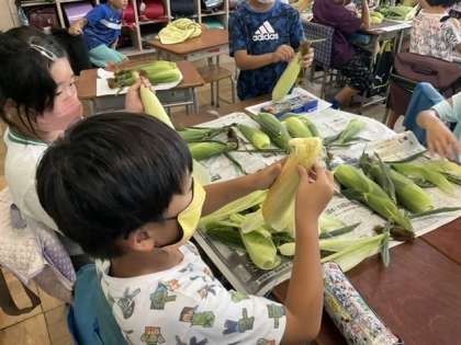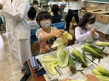 3校時、とうもろこしをむいています。