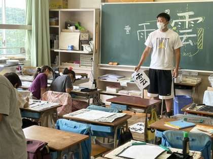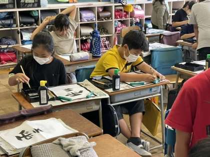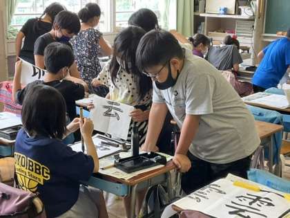ペアで、お互いの書く様子を見てアドバイスしています。
