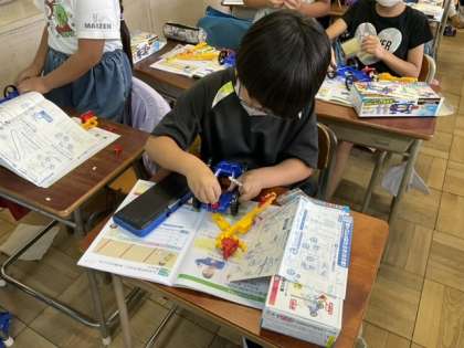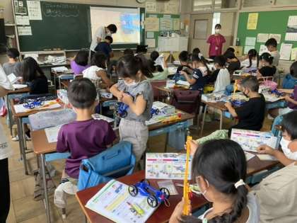 小3の理科では、ゴムの力で走る車を組み立てて実験しました。