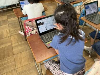 タブレットの地図を使って、まち探検をします。