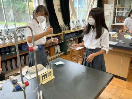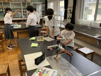 1校時、理科室で実験中です。