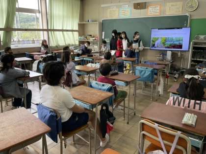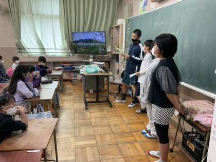 小6は、朝の時間に日光移動教室の報告を行いました。