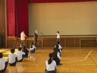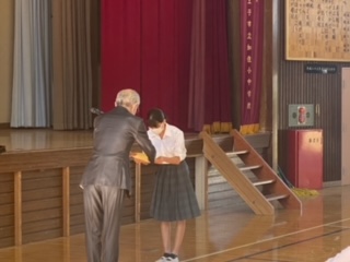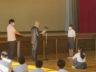 生徒会朝礼で陸上部の表彰がありました。市内2位です。