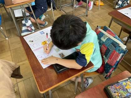 漢字の「九」とカタカナの「メ」「ク」の練習をしています。