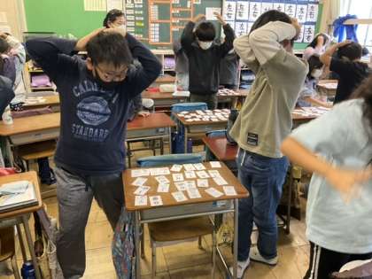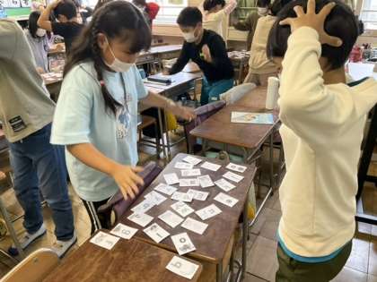 小4の外国語活動では、アルファベットカードでかるたをしました。