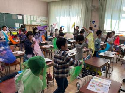 音楽では、布を使ったリズム学習や劇の歌の練習をしていました。
