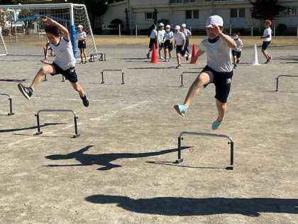 体育では、障害物やハードルを跳ぶ運動をしています。
