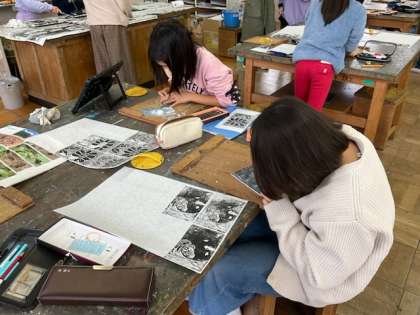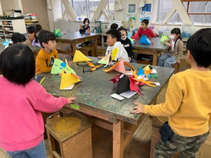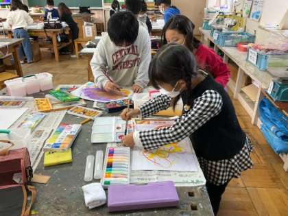 図工では、版画やカラフルな作品づくりをしています。
