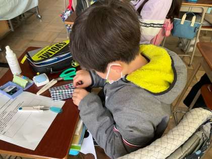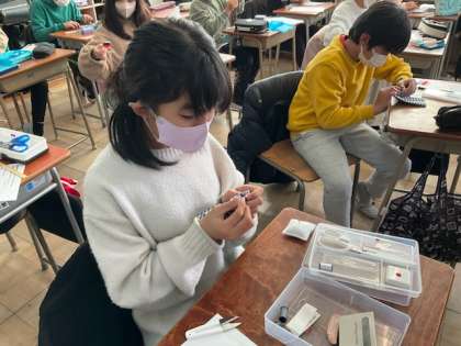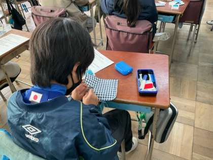 小5の家庭科では、ポケットティッシュづくりをしています。