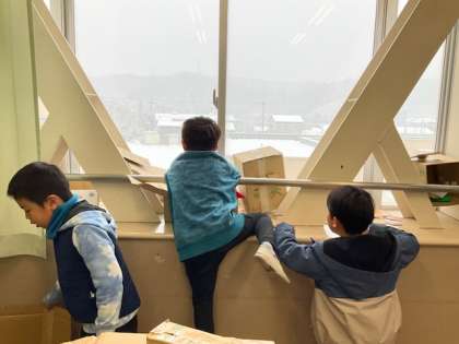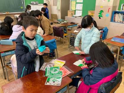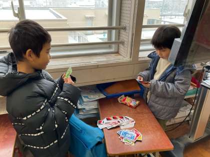 教室で、折り紙やカードゲームをしています。