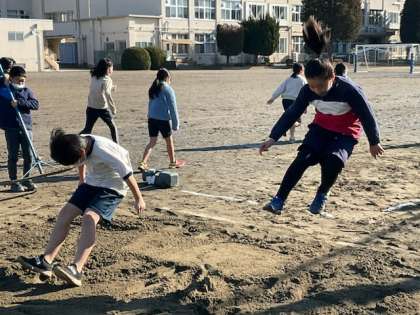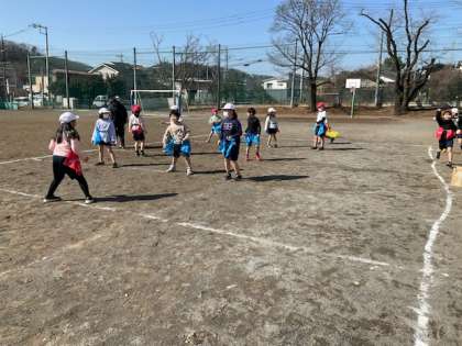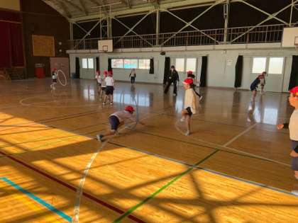 体育では、タグを取り合うゲーム、走り幅跳び、転がる輪をくぐる運動をしていました。
