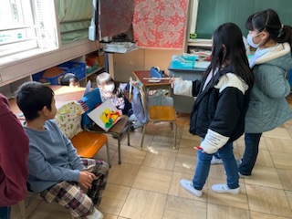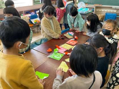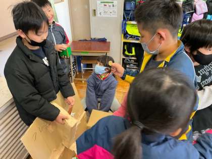 1年生が作ったおもちゃで、2年生が遊んでいます。