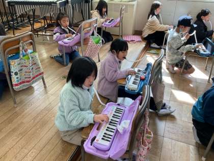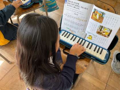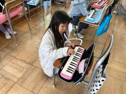 小2の音楽では、鍵盤ハーモニカで「小ぎつね」の演奏をしています。