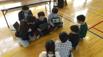 今日の外国語は、卒業間近の6年生と1年生の交流会です。