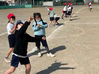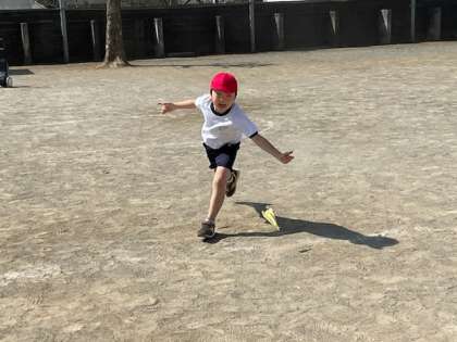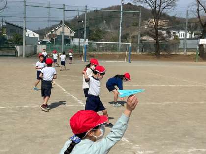 小1の体育では、投げる運動で紙飛行機を飛ばしていました。