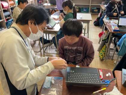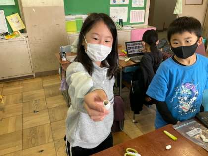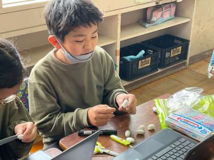 まゆ人形づくりでは、タブレットでデザインを調べながら作っていました。